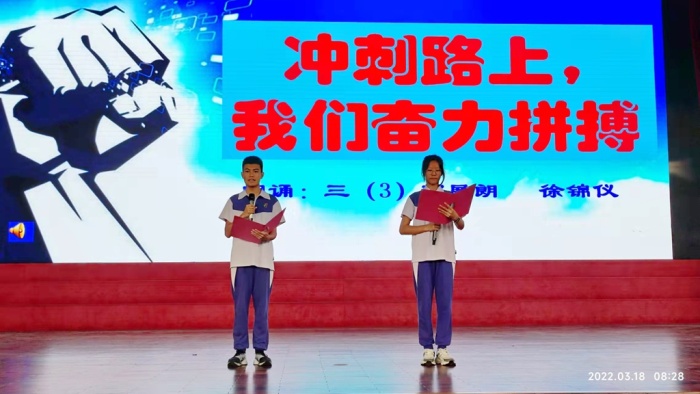 初三(3)班的鄧展朗、徐錦儀同學借詩朗誦《中考路上,我們奮力拼搏》表達全體初三學子決勝中考的信心:十載寒窗,百日苦練,何人健步登金榜;一腔熱血,萬丈豪情,我輩英才奪桂冠!兩位同學聲情并茂的朗誦贏得了同學們熱烈的掌聲。