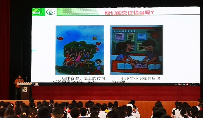 講座過程中,郭曉明老師嫻熟地運用學生常見案例、生動的圖片、視頻展示等方法,細致、形象地詮釋出進入青春期后男女生所要面臨的問題,并且教給同學們如何對待、處理的方式和方法。尤其是在青春期階段如何處理好與異性之間的交往提出一些方法和建議,給在場的同學們提供了知識基礎,以免互相曲解,造成各種誤會等。她強調,隨著青春期的到來,會隨之對異性產生好奇的朦朧情感,希望同學們能夠正確對待,在與異性交往中做到理智和謹慎,把握好交往之“度”。