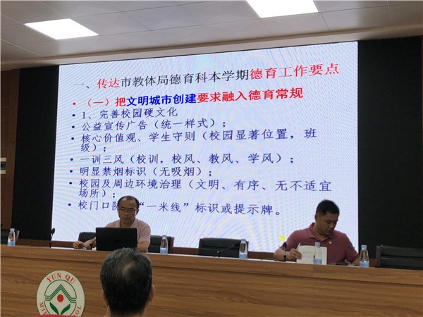 新學(xué)期、新目標(biāo)、新開始。8月31日下午,云衢中學(xué)召開新學(xué)年全校德育工作會議。會議由莫景超主任主持,校級行政、全體德育行政、各德育年級主任及全體班主任參加此次會議。