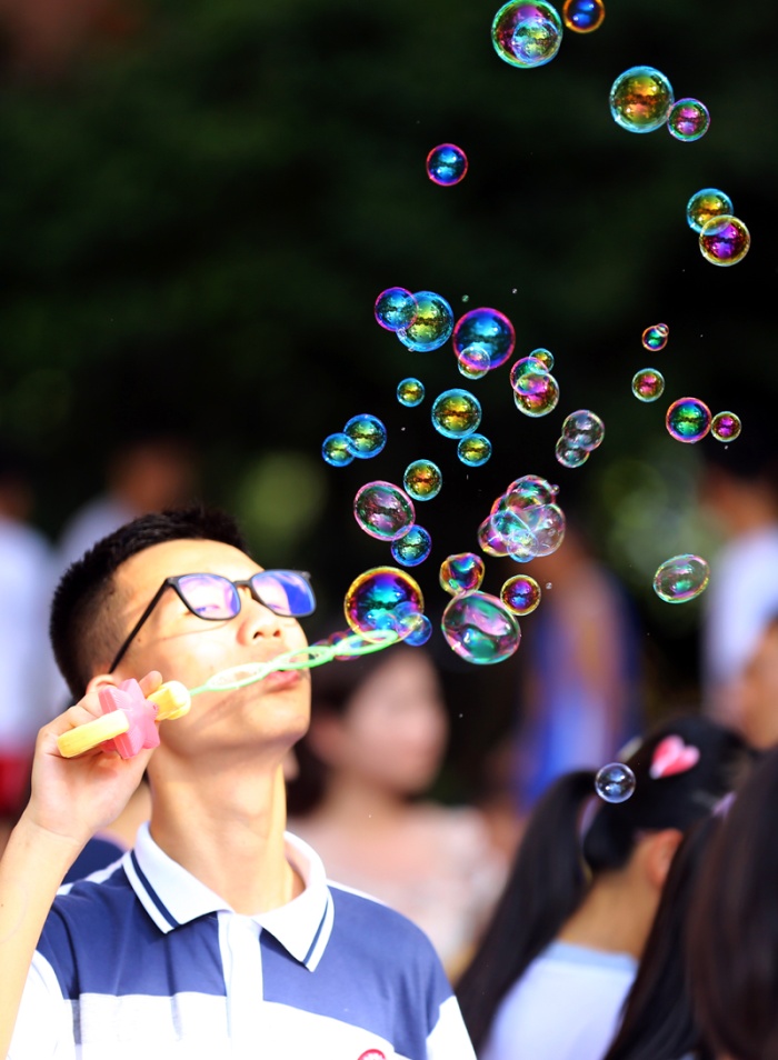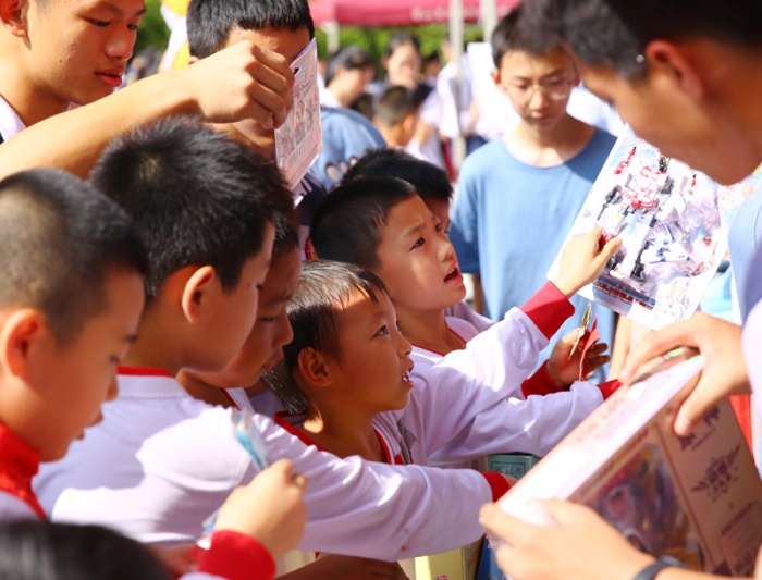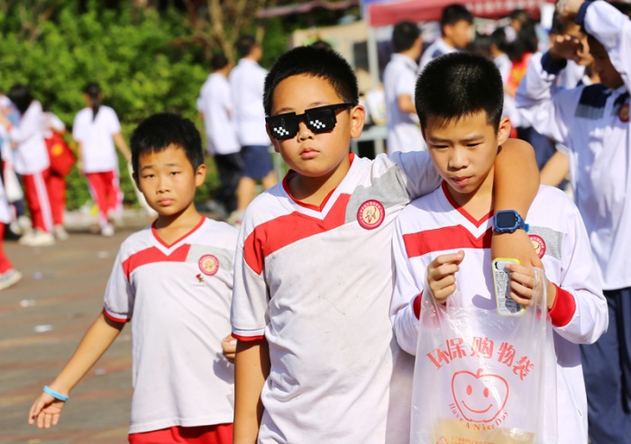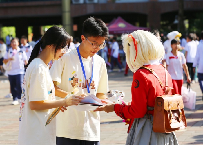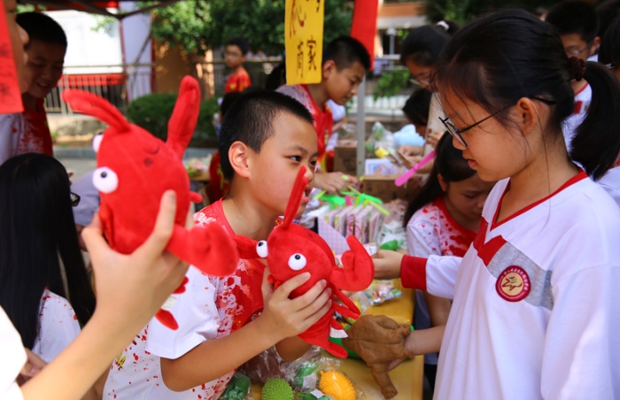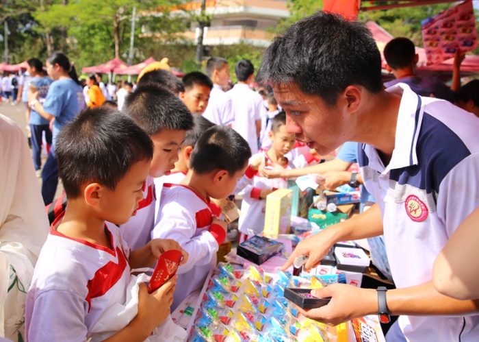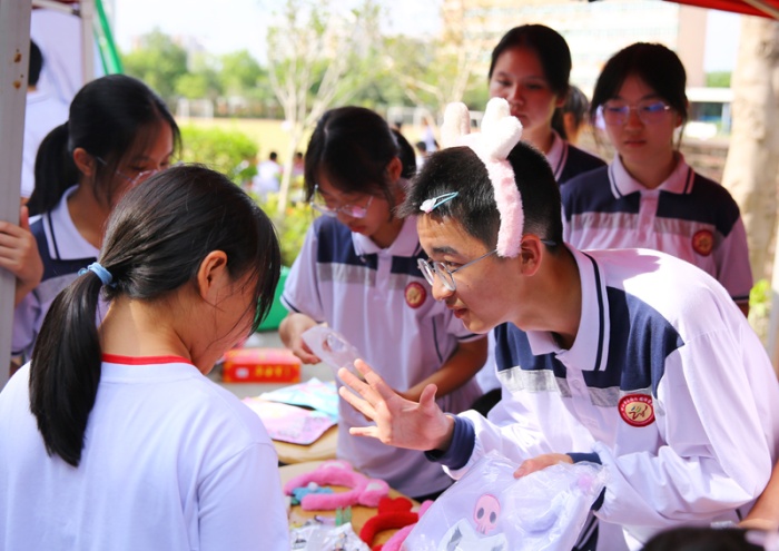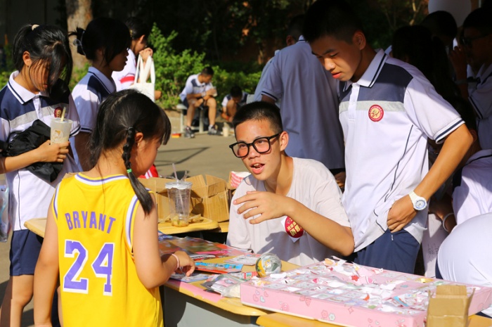“買它!買它!”“要想買得好,請往這邊走,要想劃得來,請往這邊來!”“只有你想不到,沒有你買不到!”下午一點,學(xué)校中心廣場人頭攢動,大大小小的攤位上商品琳瑯滿目,精美的手辦、自制的手工藝品、繪畫作品、玩具、飾品、文具、美食等商品一應(yīng)俱全。師生化身銷售員和顧客,叫賣的叫賣、購買的購買,一起為公益助力。