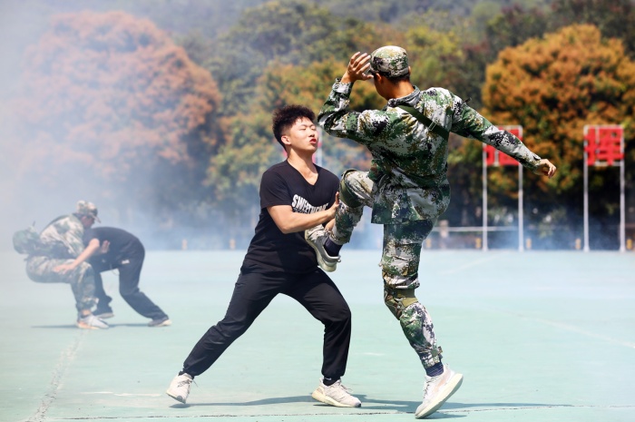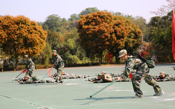 此次軍訓(xùn)成果展示共有5個(gè)方陣接受檢閱,分別是隊(duì)列方陣、拳術(shù)方陣、匕首操方陣、戰(zhàn)術(shù)演練方陣和手語操方陣。隊(duì)列方陣表演中,同學(xué)們熟練掌握了稍息立正、停止間轉(zhuǎn)法、敬禮禮畢等隊(duì)列訓(xùn)練科目;匕首操方陣氣勢浩大,一百余名英勇威武的“戰(zhàn)士”手持戰(zhàn)斗匕首,口號(hào)鏗鏘動(dòng)作剛勁;軍體拳方陣動(dòng)作精練實(shí)用、舒展大方,戰(zhàn)術(shù)演練方陣迅速標(biāo)準(zhǔn)的完成了翻滾前進(jìn)、臥倒在地、匍匐前進(jìn)等一系列軍事技能動(dòng)作,一招一式干凈利落……精彩的表演充分展示了同學(xué)們這幾天來的“從軍”成果和精神風(fēng)貌。