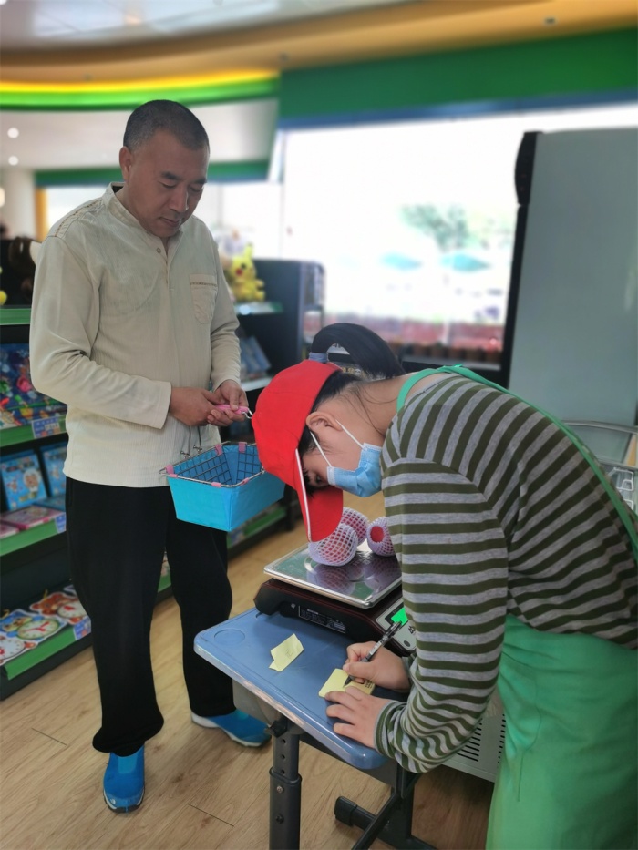 3月15日上午,由培高年級(jí)學(xué)生組成的博愛超市服務(wù)團(tuán)隊(duì)在一系列緊鑼密鼓的前期準(zhǔn)備后,正式開始了本學(xué)期的超市營(yíng)業(yè)。有了上學(xué)期的工作經(jīng)驗(yàn),學(xué)生們已經(jīng)可以熟練地分工合作、按照流程接待客人。超市內(nèi)的商品有部分調(diào)整,上架了更為營(yíng)養(yǎng)健康的零食、水果和奶制品,除此以外本學(xué)期還新增了一個(gè)“打稱員”的崗位,專門負(fù)責(zé)為超市新進(jìn)的時(shí)令水果進(jìn)行稱重、打價(jià)格。這非常考驗(yàn)學(xué)生們對(duì)電子秤的使用能力,不過這點(diǎn)事難不倒有著竹苑市場(chǎng)賣菜經(jīng)驗(yàn)的培高學(xué)生們。只見新上任的“打稱員”熟練地將顧客遞過來的蘋果穩(wěn)穩(wěn)地放在電子秤上,麻利地按價(jià)格鍵,然后再把金額抄寫下來,和蘋果一起裝進(jìn)袋子里,交給顧客,一套動(dòng)作流暢自如、老練成熟。