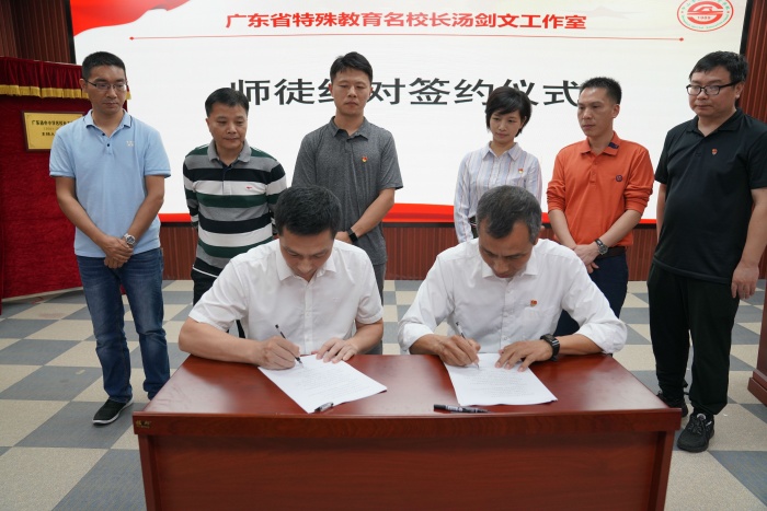 工作室成員代表講話完畢后,主持人與每位學(xué)員分別進(jìn)行簡單但又隆重的師徒結(jié)對簽約儀式,讓工作室主持人和學(xué)員的職責(zé)及研修方向更加明確。最后,中山市教師發(fā)展中心周立勝主任在講話中指出,湯劍文工作室一直都是中山市的特色品牌工作室,一直為全市乃至全省的特殊教育發(fā)展貢獻(xiàn)著力量,希望在新一輪工作室建設(shè)中,明確新時(shí)期的新任務(wù)、新要求,進(jìn)一步更新理念,創(chuàng)新培養(yǎng)模式和方法,擔(dān)負(fù)起思想引領(lǐng)、實(shí)踐指導(dǎo)和示范帶動(dòng)的時(shí)代使命,履行名校長的責(zé)任與擔(dān)當(dāng)。