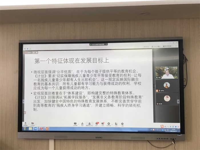 培訓(xùn)中,鄧教授還對(duì)《教育部關(guān)于加強(qiáng)殘疾兒童少年義務(wù)教育階段隨班就讀工作的指導(dǎo)意見》和《國務(wù)院辦公廳關(guān)于轉(zhuǎn)發(fā)教育部等部門“十四五”特殊教育發(fā)展提升行動(dòng)計(jì)劃的通知》2份重要文件的要點(diǎn)進(jìn)行了解讀,對(duì)接下來融合教育的發(fā)展目標(biāo)、實(shí)施策略、支持體系以及師資培訓(xùn)、科學(xué)評(píng)估、資源中心(教室)建設(shè)進(jìn)行了具體說明,讓老師們對(duì)國家融合教育相關(guān)政策及發(fā)展走向有一個(gè)總體把握。在講到動(dòng)情處時(shí),鄧教授呼吁普校隨班就讀教師多理解和支持特殊教育,通過普特融合和相互支持,切實(shí)保障殘疾兒童青少年平等接受教育的權(quán)利,做到有教無類、因材施教,幫助他們共享發(fā)展成果,讓其一樣享人生出彩機(jī)會(huì)。在培訓(xùn)的最后環(huán)節(jié),并對(duì)老師們提出的問題和疑惑進(jìn)行解答,為老師們指點(diǎn)迷津、智慧引路,讓老師們?nèi)玢宕猴L(fēng)、豁然開朗。