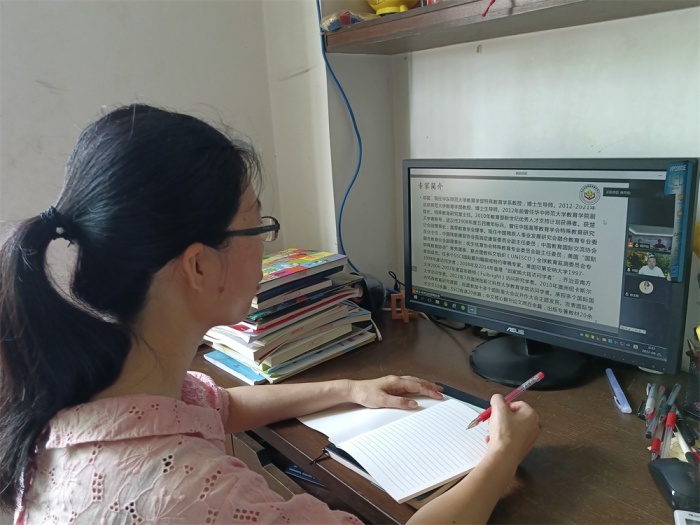 相聚云端,攜手共研。根據(jù)當(dāng)前疫情防控形勢(shì)要求,本次培訓(xùn)采用線上直播學(xué)習(xí)的形式進(jìn)行。講座中,鄧教授從隨班就讀與融合教育、新時(shí)代我國適宜的融合教育本土模式的形成與內(nèi)涵、新時(shí)代我國適宜的融合教育本土模式的實(shí)踐特點(diǎn)和發(fā)展方向、“十四五”特殊教育發(fā)展提升行動(dòng)計(jì)劃解讀等方面進(jìn)行講解。他從隨班就讀談到融合教育,從保障殘障學(xué)生的入學(xué)率到致力于為每一個(gè)孩子提供高質(zhì)量的教育服務(wù),回顧和梳理了我國隨班就讀工作發(fā)展至今的歷程,讓參訓(xùn)教師明白了為每個(gè)特殊兒童提供公平、高質(zhì)量的教育機(jī)會(huì)以及構(gòu)建完整融合教育支持體系的必要性和重要性。在講解的過程中,鄧?yán)蠋熃Y(jié)合具體實(shí)踐案例進(jìn)行解析,語言生動(dòng)形象,對(duì)特殊兒童行為管理的原則等進(jìn)行深入淺出的分析并提出問題解決策略,給予學(xué)員們很多啟發(fā);他對(duì)中山市的融合教育氛圍深表肯定,在分享中山“做一個(gè)有溫度的教育者”、“讓每一個(gè)孩子都有機(jī)會(huì)站在舞臺(tái)的中央”等優(yōu)秀實(shí)踐案例時(shí),寄語老師們要有責(zé)任心、良心、愛心、耐心和奉獻(xiàn)心,提出了“負(fù)面的問題要用正向的方法解決”、“好的教育方法是通用的”、“融合教育要注重社會(huì)交往”等要點(diǎn)。教師們認(rèn)真傾聽、專心做筆記并在評(píng)論區(qū)積極發(fā)言!
