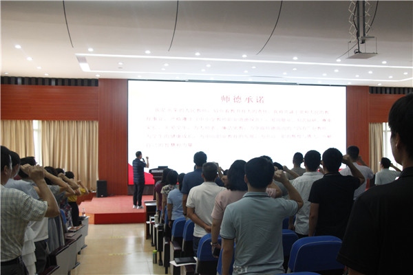 會上,全體教職工在校黨總支副書記、副校長章利建帶領下進行師德師風建設宣誓。校黨總支紀檢委員郭冬冬帶領大家重溫了《關于全面深化新時代教師隊伍建設改革的意見》等文件精神,要求大家務必加強組織紀律、工作紀律、生活紀律,按照“自律”、“規(guī)范”的要求做更好的自己。