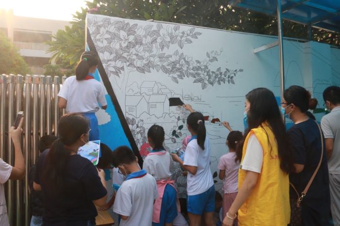 7點(diǎn)20分,墻繪活動(dòng)在學(xué)校西門正式開始。盡管八月的太陽(yáng)驕陽(yáng)似火,但這并沒(méi)有阻擋學(xué)生和家長(zhǎng)們的熱情,調(diào)顏料、勾輪廓、涂色彩,他們手中的畫筆時(shí)而急速馳騁,時(shí)而細(xì)細(xì)勾勒,不一會(huì)兒,一朵朵姹紫嫣紅的三角梅在墻體綻放,墻體被繽紛的色彩注入了生機(jī),讓人眼前一亮,熱情、堅(jiān)韌的三角精神躍然紙上。給墻體穿上炫彩新衣,讓文明新風(fēng)得以傳播,不僅美化了生活環(huán)境,也拓展了宣傳陣地。一面面栩栩如生的彩繪墻,已成為三角小學(xué)一道靚麗的風(fēng)景線。繪畫上墻不僅美化了村容村貌,更傳遞了三角新風(fēng)尚,讓群眾在潛移默化中受到啟發(fā)和教育,進(jìn)一步推動(dòng)全員參與創(chuàng)建文明城市活動(dòng)。