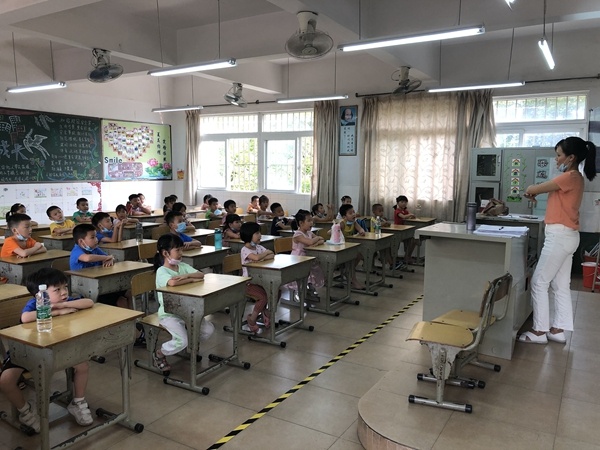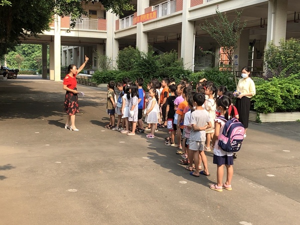 7點(diǎn)30分,高平小學(xué)東門迎來了首批“幼苗”,五個(gè)班級(jí)區(qū)域的老師也做好了充分的準(zhǔn)備。簽到、測(cè)量體溫、遞交承諾書、掃碼進(jìn)入班級(jí)群,各項(xiàng)步驟都井然有序地進(jìn)行著,孩子們?cè)诶蠋熒砗笈抨?duì),等待進(jìn)入課室。