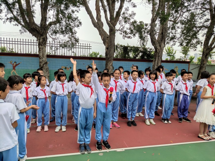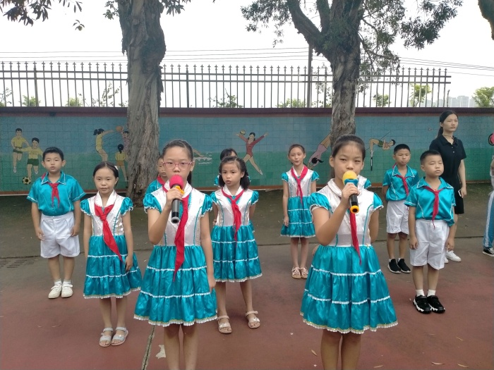 緊接著,學(xué)校旗手代表們邁著整齊劃一、鏗鏘有力的步伐,高高舉起國旗、黨旗和隊旗,從學(xué)生的隊列中莊嚴(yán)走過,全體師生行注目禮。“聽黨話、感黨恩、跟黨走”深深地烙在幼小的心靈里。
