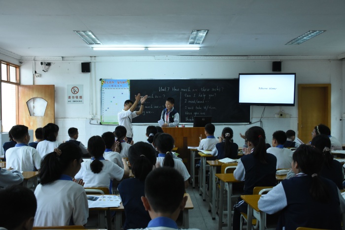 活動分成兩大部分,首先由三角中學的廖玉婷老師、沙欄初級中學的林騰新老師分別上了一節(jié)Book7上Unit7 How much are these socks? 第一課時的聽說課。課堂上,兩位老師呈現(xiàn)了各自的年輕優(yōu)勢,課堂活力四射,互補共進。課堂上廖老師準備充分,強調(diào)真實語境的創(chuàng)設,通過Guessing game,帶出詞匯學習。聽力部分,注重微技能訓練,課件制作精美。如果在訓練學生的功能語言上,強調(diào)一下學生的交際語:Can I help you? Thank you 等目標語,效果會更佳。林老師注重從非智力因素培養(yǎng)學生,注重獎勵機制的實施,讓學生積極參與課堂。還有輸出環(huán)節(jié),注重與時俱進,讓學生付款用二維碼方式。兩節(jié)課各有千秋,精彩紛呈。