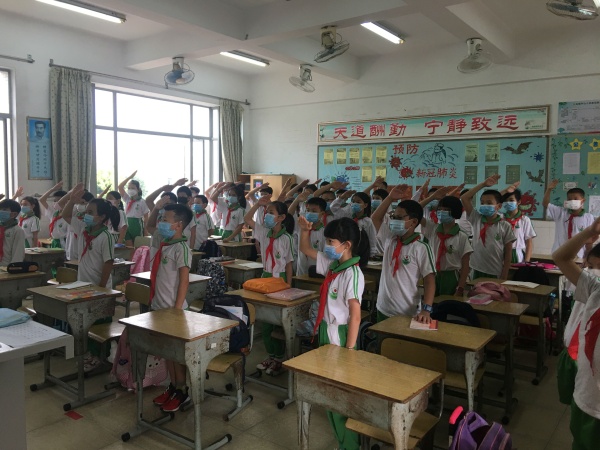 早上8:10,舉行莊嚴(yán)的升旗儀式。升旗儀式結(jié)束后,三角鎮(zhèn)中心小學(xué)周榮純校長做復(fù)學(xué)第一課國旗下講話,強(qiáng)調(diào)疫情防控形勢依然不容放松, 雖然我們不能沖在疫情防控一線,但是我們要和祖國心連心,堅(jiān)定必勝的信念,體現(xiàn)我們少年兒童的責(zé)任感和使命感。