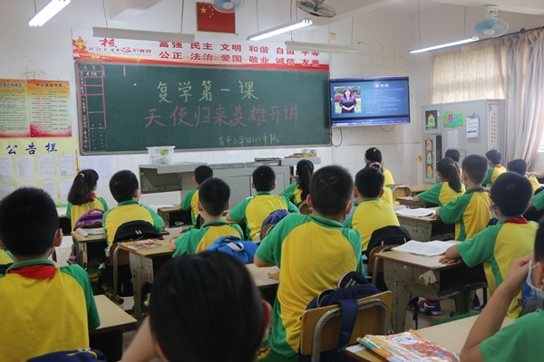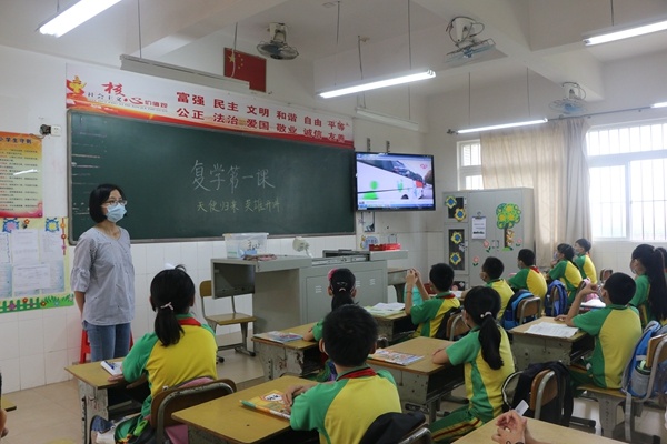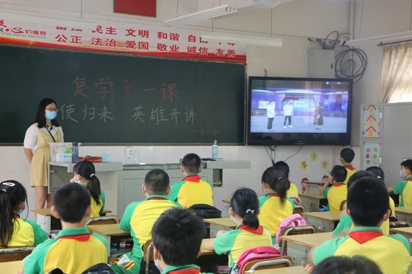 在莊嚴的升旗儀式后,各班班主任組織全體學(xué)生共同學(xué)習(xí)中山市中小學(xué)“復(fù)學(xué)第一課”主題班會?!皬?fù)學(xué)第一課”以“天使歸來,英雄開講”為主題,把疫情防控中涌現(xiàn)出的典型事跡和先進人物作為“教材”,培養(yǎng)學(xué)生的愛國主義情懷,以實際行動詮釋立德樹人、鑄魂育人的使命擔(dān)當(dāng)。緊接著,班主任們加強疫情防控知識的宣傳和生命教育,教育學(xué)生養(yǎng)成良好的衛(wèi)生習(xí)慣和文明的行為習(xí)慣,讓愛國主義教育、生命教育、責(zé)任教育、感恩教育在學(xué)生心中牢牢扎根,進一步激發(fā)學(xué)生們的愛國熱情。