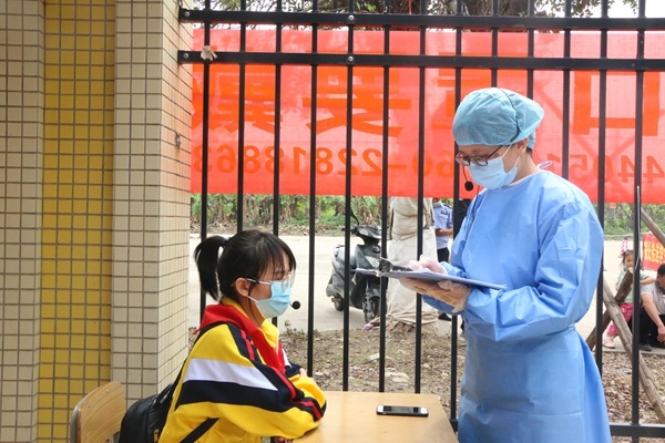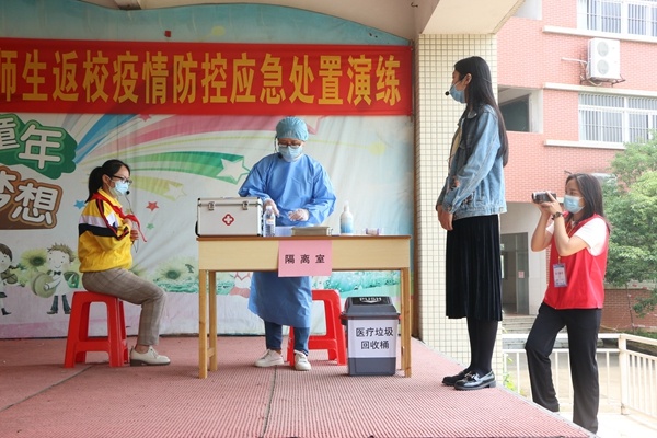 上午10點(diǎn)30分,演練正式開(kāi)始。學(xué)校開(kāi)放大門,由老師扮演的學(xué)生按照地面的1米距離標(biāo)識(shí)保持間距,有序入校。校園門口設(shè)置了4條檢測(cè)通道,每個(gè)通道配備1名老師進(jìn)行體溫檢測(cè)和消毒。體溫檢測(cè)正常的學(xué)生進(jìn)入教室, 一旦發(fā)現(xiàn)有體溫高于37.30C的師生,立即將其轉(zhuǎn)移至觀察室,重測(cè)體溫,做好記錄并第-時(shí)間上報(bào)值日行政,同時(shí)聯(lián)系班主任和家長(zhǎng)。