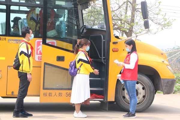 在校車乘車點(diǎn),學(xué)生有序排隊(duì),跟車員對(duì)每位學(xué)生進(jìn)行體溫檢測(cè),合格者依次上車并模擬了乘車途中學(xué)生身體不適的應(yīng)急處置。