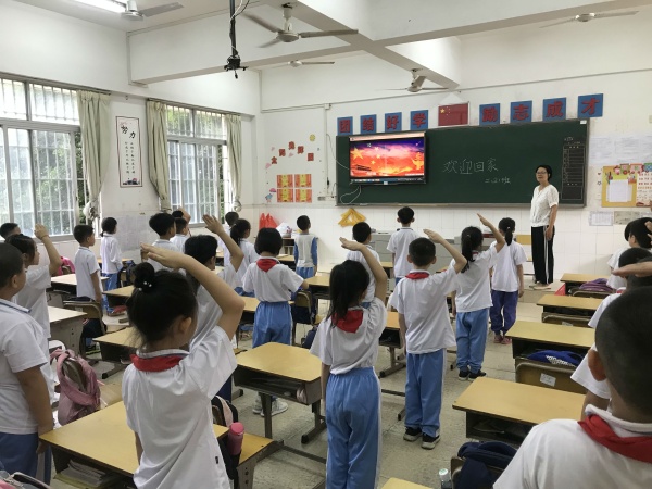 早上8:30分,一至三年級的全體師生在課室里肅立,少先隊員行隊禮,通過電視屏幕進行升旗儀式,唱響國歌。隨后,為了讓全體師生快速適應、融入校園生活,更健康成長,黃滿華校長給大家上了一堂生動的“開學第一課”。黃校長在講話中激勵師生們通過此次新冠肺炎疫情,明白什么是家國情懷,知道什么是真情陪伴,堅信磨難使人成長,更加懂得生命的珍貴。通過以上四個方面,希望全體師生守好每個人的責任,向著“光耀美德,明理修身”的目標前進,共譜光明小學教育新篇章。此外,黃校長還對復課期間注意的事項進行了強調,著力營造一個平穩(wěn)、有序、安全的校園環(huán)境。