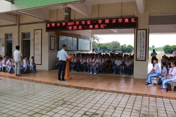 金色的九月,是溫馨的;燦爛的九月,是豐碩的,帶著秋的喜悅,光明小學(xué)迎來了新的學(xué)期,開啟了新的希望。在這收獲的季節(jié)里,在這和諧的氛圍中,全體師生齊聚新教學(xué)樓大堂通道上舉行了以“愛國是一種責(zé)任”為主題的新學(xué)期開學(xué)典禮。