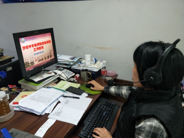 4月24日下午,沙欄中學(xué)針對(duì)“返學(xué)后疫情防控怎么做”召開(kāi)全校教師培訓(xùn)會(huì),教師們?cè)卺斸斎荷线M(jìn)行了培訓(xùn)。