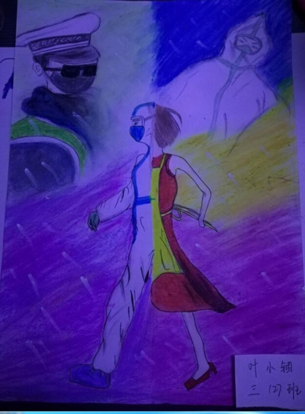選手們用畫筆禮贊戰(zhàn)疫感人事跡,用藝術(shù)謳歌最美“逆行者”,創(chuàng)作出一幅幅振奮精神、鼓舞士氣、傳播積極向上正能量的優(yōu)秀作品。三(3)班的劉祥羽的作品《與死神搶時間》描繪出醫(yī)護人員緊急救護的場景,二(3)班楊桂珍的作品《加油》用獨特的方式提醒大家做好防護。選手們的作品內(nèi)容充實,感染力強,主要圍繞在疫情防控一線的醫(yī)務(wù)人員和其他工作人員加油打氣,為“逆向而行”的先鋒致敬,向他們送上真摯的祝福:“叔叔阿姨加油!我就在您的身后!”