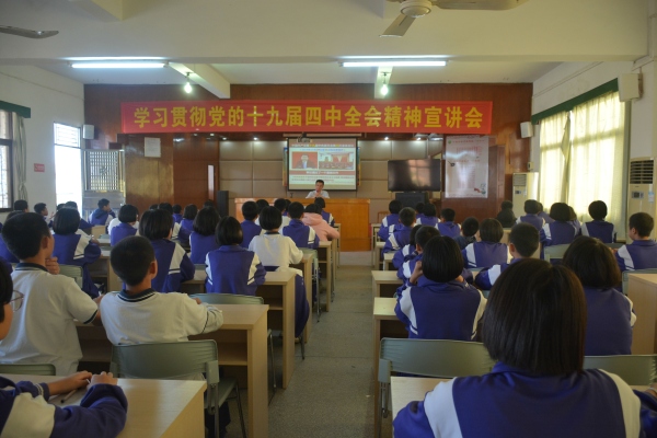為了讓學(xué)生了解國情,增進(jìn)對(duì)黨的感情,激發(fā)奮斗熱情。沙欄中學(xué)于12月26日開展了“學(xué)習(xí)貫徹黨的十九屆四中全會(huì)《決定》”宣講教育活動(dòng),該校部分學(xué)生集中到會(huì)議室,由三角鎮(zhèn)宣講團(tuán)成員、該校團(tuán)委書記盧富生主講。