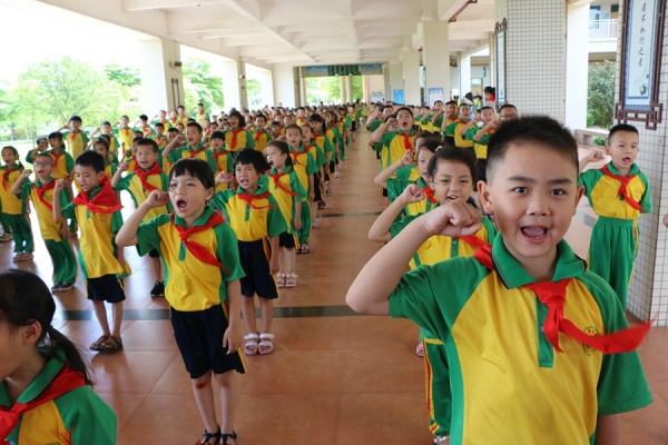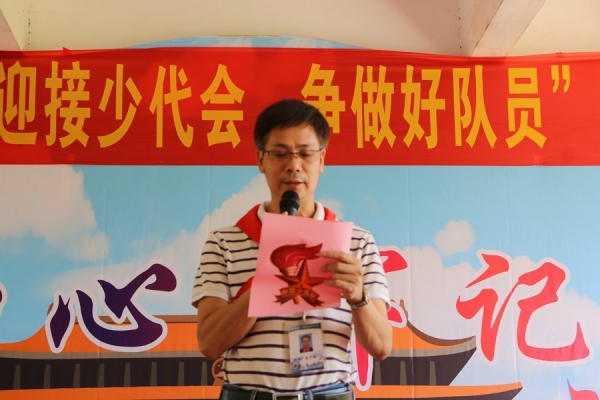 儀式正式開始之前,兩百多名待入隊(duì)學(xué)生正精神抖擻地排列在隊(duì)伍前面,整裝待發(fā),準(zhǔn)備參加他們?nèi)松械谝淮我饬x重大的、激動(dòng)人心的儀式——加入中國(guó)少年先鋒隊(duì)。伴著雄壯的出旗曲,大隊(duì)旗手與護(hù)旗手們邁著整齊的步伐,昂首前進(jìn);隊(duì)歌嘹亮,響徹校園,少先隊(duì)入隊(duì)儀式由此拉開帷幕。學(xué)校大隊(duì)輔導(dǎo)員曾麗娟老師宣讀了入隊(duì)名單后,老隊(duì)員們鄭重地為新隊(duì)員系上鮮艷的紅領(lǐng)巾;接著,曾老師給一年級(jí)的六名新中隊(duì)輔導(dǎo)員頒發(fā)聘書和授予中隊(duì)旗。隨后,新隊(duì)員代表郭永彪發(fā)言,表達(dá)了全體新隊(duì)員的心聲:“戴上鮮艷的紅領(lǐng)巾后,我就是一名光榮的少先隊(duì)員。在今后的日子里,我一定尊重老師、團(tuán)結(jié)同學(xué)、好好學(xué)習(xí),不辜負(fù)老師和父母對(duì)我的期望?!比缓?,莫文杰校長(zhǎng)發(fā)表了熱情洋溢的講話。他在講話中勉勵(lì)鞭策隊(duì)員們向上向善。同時(shí),他指出全體少先隊(duì)員們,當(dāng)以嚴(yán)格的標(biāo)準(zhǔn)規(guī)范自己的行為,努力學(xué)習(xí),茁壯成長(zhǎng)。他希望少先隊(duì)員們能夠牢記習(xí)爺爺?shù)囊笄薪虒?dǎo),爭(zhēng)做好隊(duì)員,從小學(xué)先鋒,長(zhǎng)大做先鋒!做到刻苦學(xué)習(xí)知識(shí),堅(jiān)定理想信念;磨練堅(jiān)強(qiáng)意志,鍛煉強(qiáng)健體魄;為實(shí)現(xiàn)中華民族偉大復(fù)興的中國(guó)夢(mèng)時(shí)刻準(zhǔn)備著!最后,少先隊(duì)大隊(duì)輔導(dǎo)員曾麗娟老師帶領(lǐng)隊(duì)員們呼號(hào)?!皶r(shí)刻準(zhǔn)備著!”這嘹亮的呼號(hào)聲,讓人心頭為之一振,自豪感油然而生。