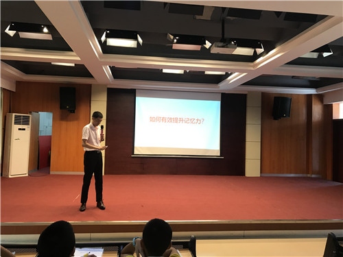 接著,由記憶學(xué)習(xí)法高級講師吳杰斌老師做“如何有效提升記憶力”的講座。吳老師利用身體部位教會同學(xué)們科學(xué)記憶十二星座,幾分鐘的時間同學(xué)竟然能夠快速并準(zhǔn)確地記住了十二星座。還利用圖片關(guān)聯(lián)法教會同學(xué)們記憶魯迅的七部作品。吳老師讓同學(xué)發(fā)揮自己的想象力,學(xué)著自己想象單詞之間的關(guān)聯(lián),以此來記憶單詞,掌握了方法的同學(xué)們很快完成了挑戰(zhàn),體會到學(xué)習(xí)的樂趣。
