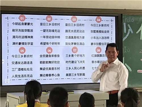 講完故事,小魚姐姐給隊(duì)員們展示了樊爺爺自己創(chuàng)作的八首咸水歌,請(qǐng)樊爺爺示范唱。原汁原味的發(fā)音、土生土長(zhǎng)的樊爺爺,伴著飛揚(yáng)的歌聲,把隊(duì)員們帶入了那久遠(yuǎn)的年代……最后樊爺爺帶著隊(duì)員們領(lǐng)唱咸水歌,整個(gè)教室洋溢著醉人的旋律。