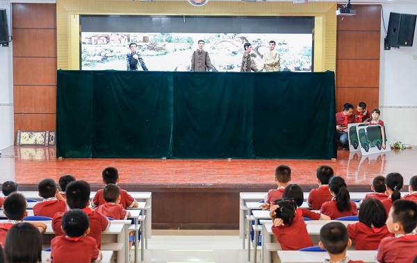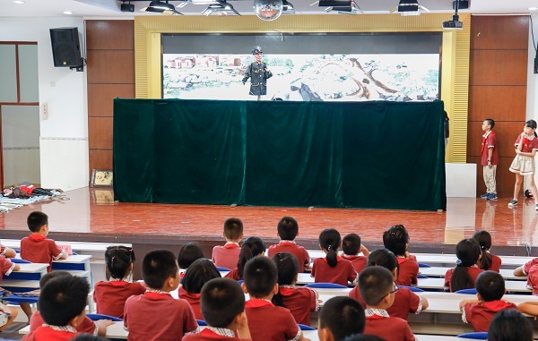 木偶戲演繹的是三鄉(xiāng)鎮(zhèn)抗日時期的一個事件《活捉飛天鴨》,工作人員通過木偶戲把隊員帶回了那段沉重的歷史中,讓學(xué)生們深刻意識到戰(zhàn)爭就發(fā)生在我們身邊。在觀看木偶戲的過程中,學(xué)生那炯炯有神的眼睛、那認(rèn)真聽講的表情、那肩平身正的坐姿無一不說明學(xué)生對這段歷史的重視。