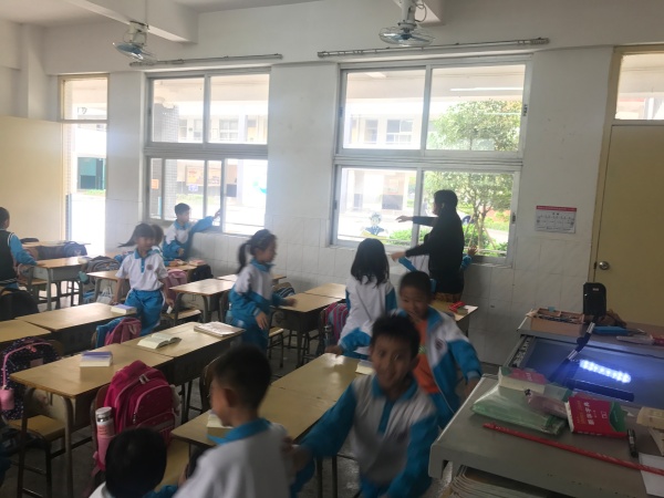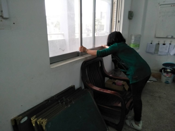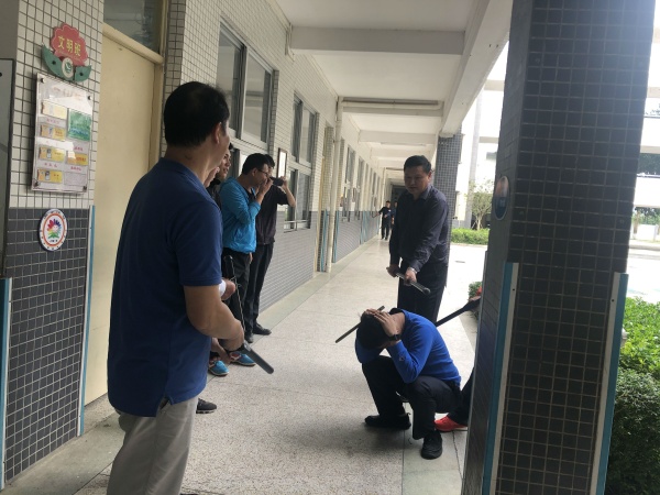 3月27日下午3點,演練活動正式開始。一名“不法分子”以約見老師為理由要求進校園。學(xué)校保安要求其出示身份證等有關(guān)證件進行登記,然而這名“不法分子”趁保安不注意時強行闖入校園。一名保安立刻上前制止,另外一名保安迅速按下一鍵報警器。全校師生聽到警報后立刻執(zhí)行“學(xué)校防暴應(yīng)急預(yù)案”。譚主任利用廣播告知師生“學(xué)校發(fā)生不法分子進入校園”的通知。并且,學(xué)校護衛(wèi)隊16名隊員拿著警棍警戒,迅速分成4隊,分別守住一樓4個樓梯口,防止不法分子沖入教學(xué)樓傷害學(xué)生。上課老師立即組織學(xué)生緊閉門窗,用課桌、木柜頂住門窗,防止不法分子破門窗而入。在室外上課的老師,指揮好學(xué)生緊急疏散到教室或安全地帶。