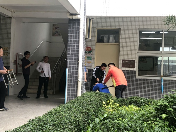 “不法分子”沖入校園,經(jīng)過大堂,徑直走向教學(xué)樓,企圖從靠左邊的樓梯上樓。看守在這個樓梯口的4名護衛(wèi)隊員立刻拿起器械制止“不法分子”,附近的護衛(wèi)隊員也跑過來支援。護衛(wèi)隊成員們迅速將“不法分子”制服,并由4名民警押回派出所。最后,譚主任用廣播宣布演練活動結(jié)束,校園恢復(fù)正常秩序。