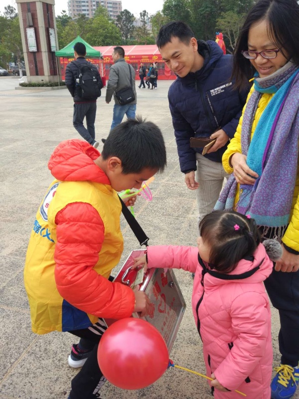 早上9:00,親子義工們來到了集中的地方,滿懷信心今天自己的行動一定能籌集更多的善款。大家穿好義工服,拎好籌款箱,來,擺出燦爛的笑容,來一個大合照!帶隊的負責(zé)人李冬梅、劉紅迅速組織各位,分配好任務(wù),有留下打汽球的,有外出籌款的。各家庭自由組合,三五成群,帶著愛心,付出行動,出發(fā)!
