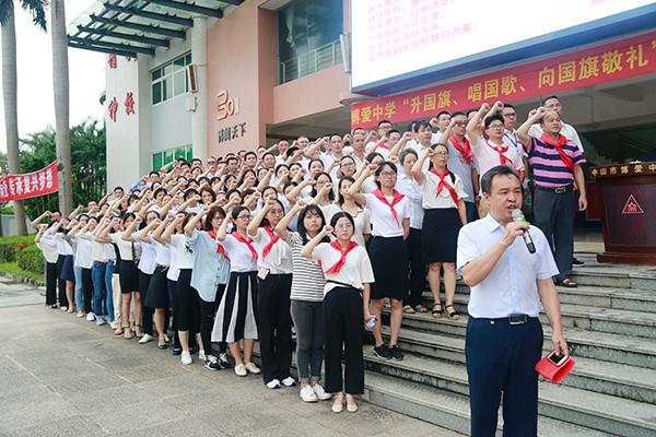 博愛中學(xué)的廣場上人頭攢動,紅旗飄飄。在莊嚴(yán)的升國旗、唱國歌、向國旗敬禮中 ,全體師生凝望著徐徐升起的五星紅旗,心中充滿了對祖國母親的無限熱愛和自豪。