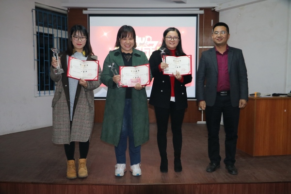 緊接著是精彩的頒獎(jiǎng)時(shí)刻。在首屆“東華杯”教學(xué)大賽的舞臺(tái)上,蔣飛燕老師、曾思佳老師、歐曉麗老師、楊磊老師、寧龍鋒老師和莫晶晶老師在自己的課堂教學(xué)中滿懷激情、富有創(chuàng)新意識(shí),表現(xiàn)優(yōu)秀,獲得優(yōu)秀獎(jiǎng);趙小華老師、江彩絲老師、梁彩容老師、謝秀霞老師、李晶晶老師和何翠陽老師經(jīng)驗(yàn)豐富、業(yè)務(wù)精良,教學(xué)做到講練無縫對(duì)接,表現(xiàn)突出,榮獲三等獎(jiǎng);徐群老師、黃曉玲老師、陳垵鈉老師和劉海英老師學(xué)科素深厚,課堂另辟路徑,創(chuàng)設(shè)情境,深情演繹,表現(xiàn)精彩,喜獲二等獎(jiǎng);陳麗冬老師、陳嘉欣老師和張靜老師的課堂則理念新、設(shè)計(jì)巧、師生互動(dòng)默契、課堂教學(xué)目標(biāo)達(dá)成度高、教學(xué)特色彰顯,教師魅力綻放如畫,堪稱表現(xiàn)完美,摘得一等獎(jiǎng)。英語科組在這次教學(xué)大賽中,不管是從賽前團(tuán)隊(duì)協(xié)作,還是參賽教師的得分,表現(xiàn)均比較突出,被評(píng)為“優(yōu)秀科組”。徐文校長(zhǎng)等領(lǐng)導(dǎo)為以上獲獎(jiǎng)老師、團(tuán)體頒發(fā)了證書并合影留念。