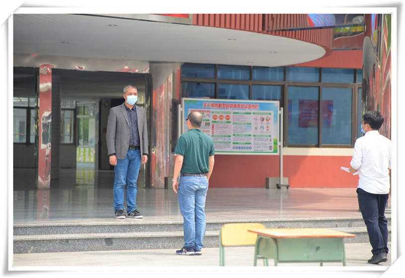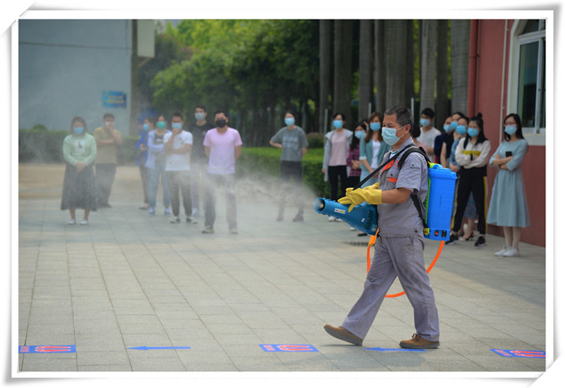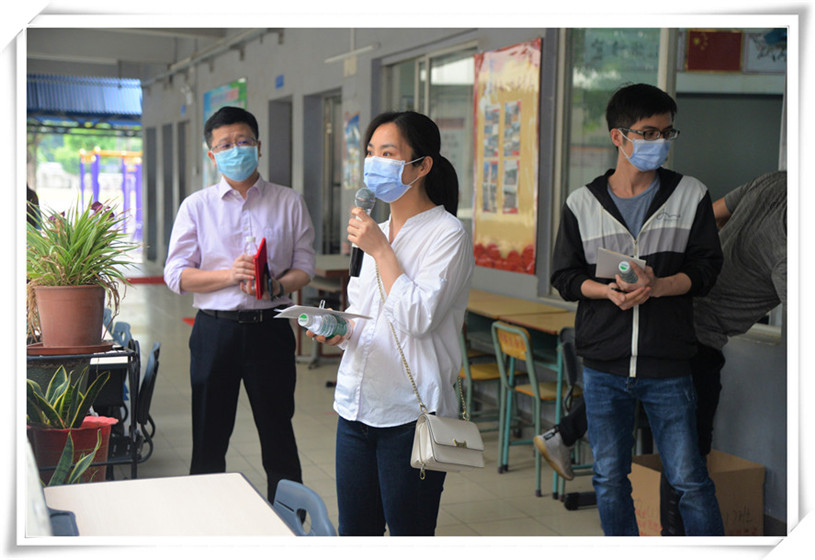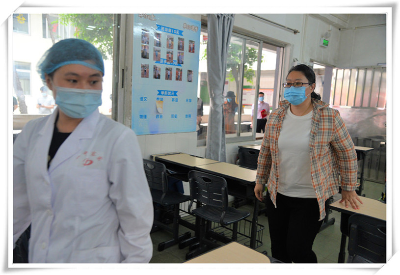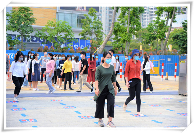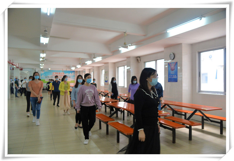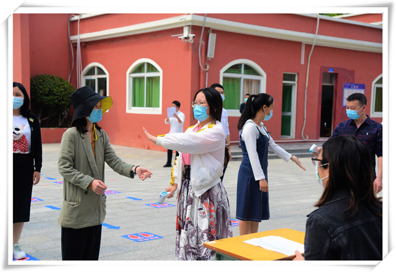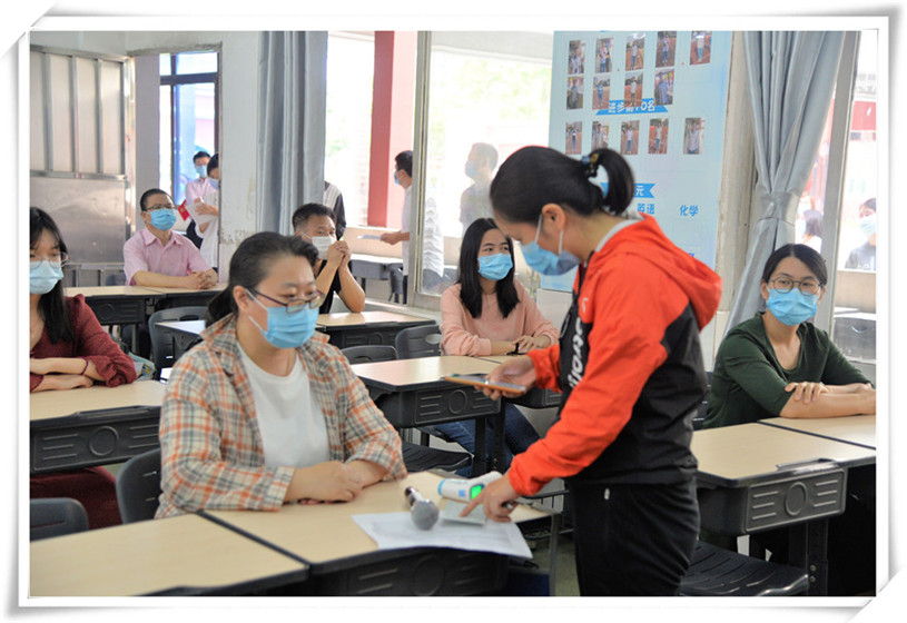 12名工作人員對(duì)學(xué)生進(jìn)行體溫檢測(cè)登記,并按照學(xué)號(hào)引導(dǎo)其按照指定路線有序進(jìn)入教室。