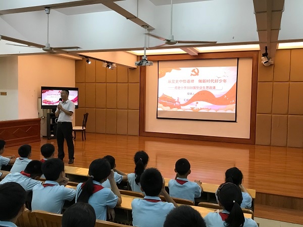 又是一年鳳凰花開,又是一年畢業(yè)季。為了鼓勵(lì)2020屆畢業(yè)生勇敢擁抱未來,繼續(xù)奮勇前行,在這個(gè)特別的時(shí)期,虎遜小學(xué)黨支部書記黃金奇校長在學(xué)校的多媒體室為本屆的畢業(yè)生上了一節(jié)別開生面的思政課。