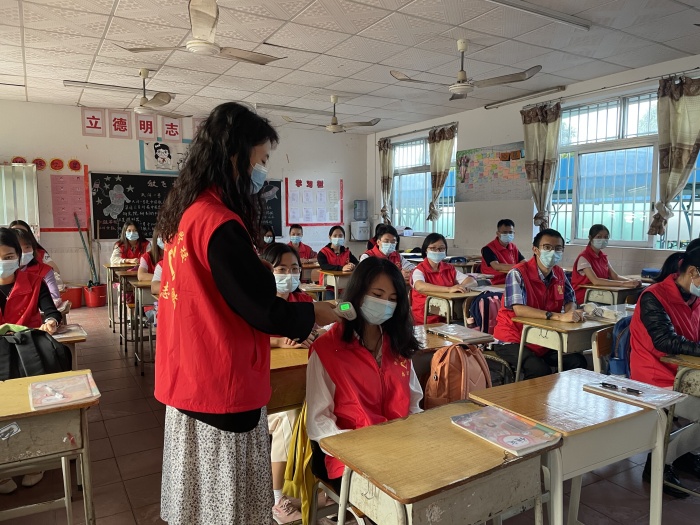 17日早上,學(xué)校開展防控模擬演練,模擬師生在上課期間有癥狀異常情況的處置流程。當(dāng)堂教師在例行晨檢中,發(fā)現(xiàn)有“學(xué)生”發(fā)熱現(xiàn)象,老師立即讓該生佩戴好口罩,并引導(dǎo)其出班級,與其他學(xué)生保持距離,立即打電話,讓“保健老師”來復(fù)檢,保健老師將其帶到觀察室,初步判斷為疑似病例,立即上報學(xué)校防控負(fù)責(zé)人,再逐級上報到“鎮(zhèn)教育主管部門和疫情防控部門”。