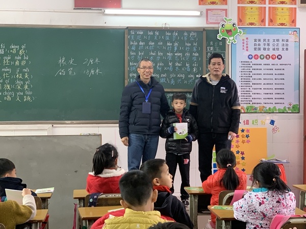 檢查組首先到中心小學(xué)二(2)班課室為王良政同學(xué)頒獎(jiǎng),王良政的作品《愛(ài)眼問(wèn)答比賽》在2020年全國(guó)愛(ài)眼日廣東省中小學(xué)生愛(ài)眼護(hù)眼作品征集活動(dòng)榮獲攝影作品小學(xué)組優(yōu)秀獎(jiǎng)。中山市衛(wèi)生局領(lǐng)導(dǎo)祝賀王良政同學(xué)獲獎(jiǎng),并倡議同學(xué)們要向他學(xué)習(xí)。隨后,何主任為二(2)班的孩子發(fā)放了“關(guān)注眼睛健康、遠(yuǎn)離近視眼”資料,并對(duì)學(xué)生開展了近視防控講座,讓學(xué)生了解到近視的危害,如何預(yù)防近視,愛(ài)護(hù)眼睛。