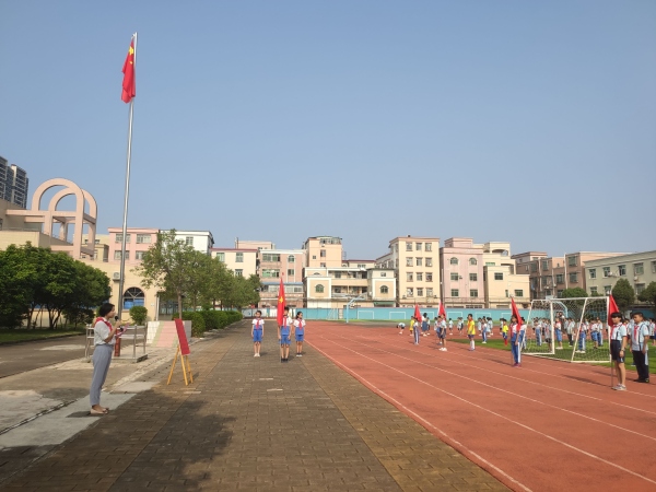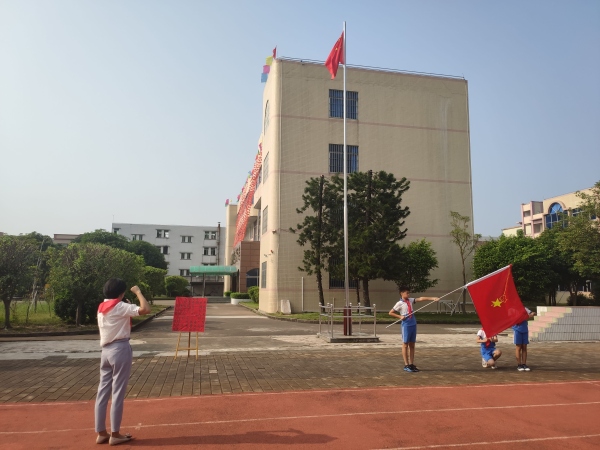 在莊嚴(yán)的升旗儀式后,大隊(duì)長(zhǎng)宣布活動(dòng)開始。隊(duì)員們將目光投注在火紅的隊(duì)旗上。隨著出旗曲的響起,護(hù)旗手們踏著整齊的步伐,從隊(duì)員們身旁走過,來到國(guó)旗臺(tái)下。400多名充滿朝氣的小隊(duì)員唱起了《中國(guó)少年先鋒隊(duì)隊(duì)歌》。接著,面對(duì)著火紅的隊(duì)旗,隊(duì)員們跟隨著大隊(duì)輔導(dǎo)員彭思劬老師一起重溫入隊(duì)誓詞。錚錚的誓詞,響徹云霄,落在每位隊(duì)員的心上。