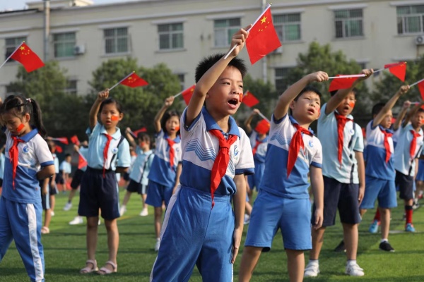 首先,是全校集體的升旗儀式。各個(gè)班級(jí)7:50前就在教室里做好了準(zhǔn)備工作,每個(gè)學(xué)生臉上都貼著國旗,手上拿著小紅旗,學(xué)生們的臉上洋溢著歡笑,心情十分激動(dòng)。7:53歌聲響起,一至六年級(jí)有條不紊、有秩序的來到操場集合,準(zhǔn)備進(jìn)行升旗儀式。升旗儀式開始,護(hù)旗手精神抖擻,踢著整齊的正步朝升旗臺(tái)走去,少先隊(duì)員們五指并攏,高舉頭頂,深情而莊嚴(yán)地凝視著國旗。當(dāng)國歌聲響起,五星紅旗徐徐升起時(shí),全校師生嘹亮的歌聲響徹校園,所有人的臉上都洋溢著歡樂和自豪。