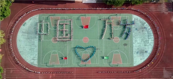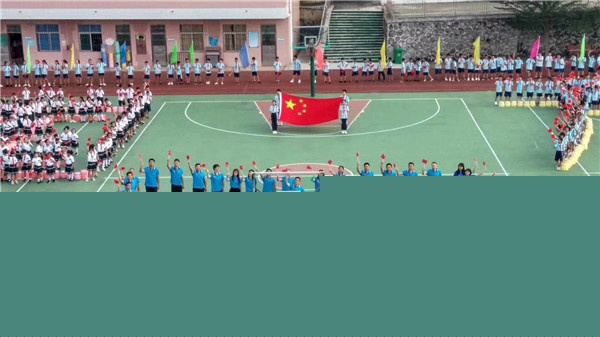 快閃航拍從《我和我的祖國(guó)》的旋律開始,“我和我的祖國(guó),一刻也不能分割,無論我走到哪里,都流出一首贊歌……”。在優(yōu)美的旋律中,全校師生手持一面面鮮艷的五星紅旗,先是低年級(jí)學(xué)生邁著歡快的步伐來到操場(chǎng)上,排成“中國(guó)”字樣;接著中年級(jí)部分學(xué)生邁著優(yōu)雅的步伐行進(jìn),排成“萬歲”字樣;跟著音樂的節(jié)奏,部分中低年級(jí)學(xué)生、高年級(jí)學(xué)生邁著整齊步伐,或圍繞操場(chǎng)排成一圈,或站在教學(xué)樓中,與“中國(guó)萬歲”字樣相呼應(yīng);最后出場(chǎng)的是教師團(tuán)隊(duì),在“中國(guó)萬歲”字樣前中位置形成一個(gè)“心”形圖案。