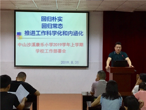 未雨綢繆布新局,謀定而動開新篇。在愉快的暑假結(jié)束之際,為確保本學(xué)期學(xué)校工作的順利進行,中山市沙溪鎮(zhèn)康樂小學(xué)于2019年8月31日召開了2019學(xué)年上學(xué)期學(xué)校全面工作部署會,全體教師參加了此次會議。本次會議由吳偉標校長主持,上午主要是校本研訓(xùn)和學(xué)校整體工作部署,下午則由學(xué)校各部門根據(jù)實際進行細節(jié)布置。