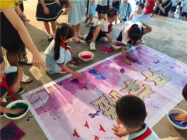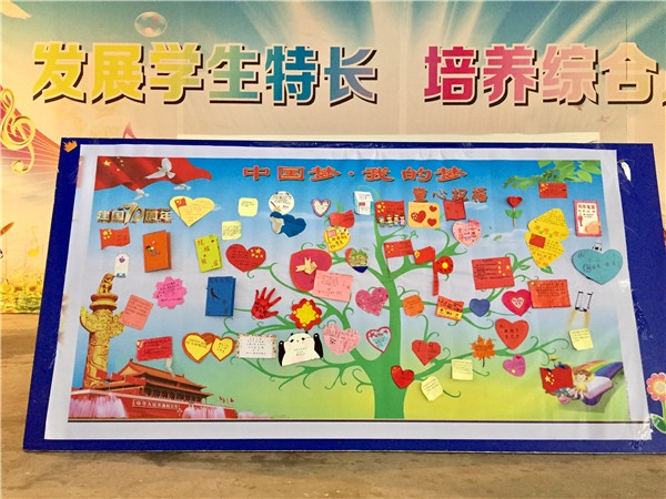最后環(huán)節(jié)是學(xué)生祝福祖國的活動,在《我和我的祖國》為背景音樂的氛圍中,先由李梓浩和關(guān)子鈞同學(xué)為代表,朗誦《我驕傲!我是中國人》,在兩位同學(xué)精彩演繹中全體學(xué)生精神肅穆,仿佛告訴自己要用實(shí)際行動為祖國獻(xiàn)禮祝福;接著是給六年級學(xué)生頒發(fā)綜合成績優(yōu)秀獎,給祝福祖國注入實(shí)際行動的力量;最后是童心獻(xiàn)祝?;顒樱阂欢昙壍母靼嗯?名學(xué)生代表在畫布上用小手印印下心中最美好的祝福,三至六年級的學(xué)生代表把自制卡片貼在心愿樹上,燃起學(xué)生的同一夢想為實(shí)現(xiàn)偉大復(fù)興的中國夢而奮斗。