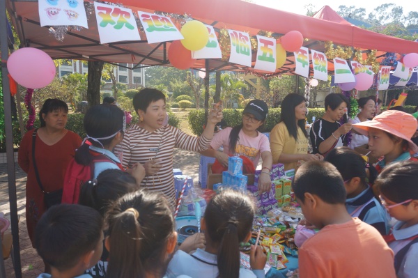 當(dāng)天下午,義工家長們早早來到學(xué)校布置攤位,每個“商鋪”的海報設(shè)計(jì)都別具特色。兩點(diǎn)十分,義賣活動正式開始,同學(xué)們有序進(jìn)場,校園恍如“集市”一下子熱鬧起來,人聲鼎沸。各班義賣物品琳瑯滿目:漂亮的學(xué)習(xí)用具、新奇有趣的玩具、讓人垂涎欲滴的美味小吃、種類繁多的飲料還有同學(xué)們捐獻(xiàn)的閑置書籍等等。除了商品的多樣性外,經(jīng)營方式更是精彩紛呈,創(chuàng)意無限。有的通過展示才藝的來吸引顧客眼球,還有的穿著恐龍服裝來招攬“顧客”,有的變身成一名小小推銷員,抱著義賣物品四處奔走、叫賣,更有的孩子固守?cái)偽?,分工合作,有的叫賣、有的理貨、有的收錢,忙得不亦樂乎。義工家長們各出奇招,賣力地推銷,還有不少熱心的家長也加入到義賣的隊(duì)伍中。孩子們邊逛邊玩,丟圈圈,撈小魚,吹乒乓球,砸金蛋等等,玩得不亦樂乎。一時間,歡笑聲,叫賣聲,討價還價聲,場面熱鬧非凡,匯成一片歡樂的海洋。