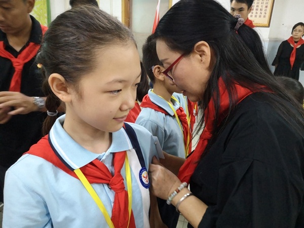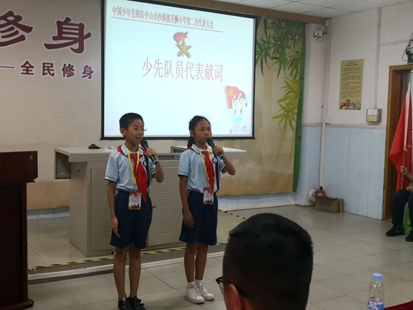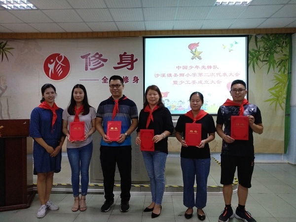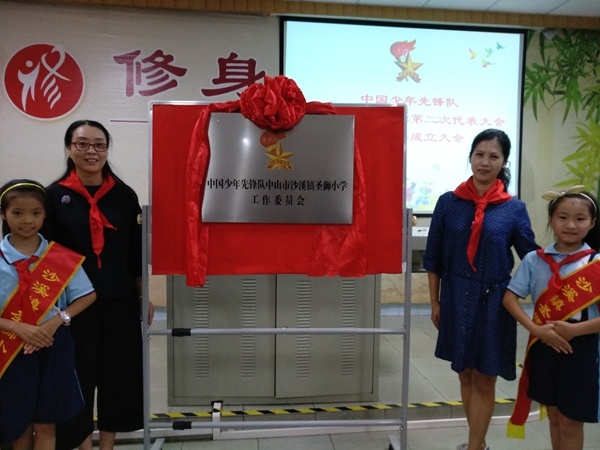 接著,大會審議通過了新一屆大隊委名單,并為新一屆大隊委授臂章。大會審議還通過了第一屆學校少工委委員名單,阮秀迎老師、黃慧芳校長和隊員代表為學校少工委成立揭牌,并為第一屆學校少工委委員頒發(fā)聘書,中山市沙溪鎮(zhèn)圣獅小學第一屆少先隊工作委員會宣告成立!