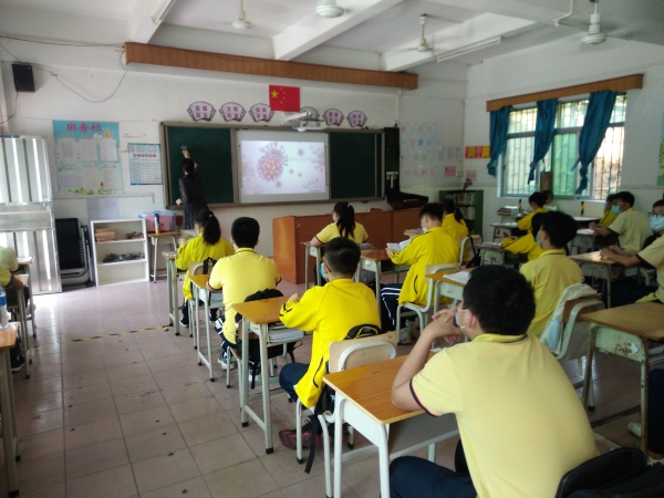 然后班主任強調(diào)學校相關防疫事宜。在校內(nèi)不聚集,不打鬧,不串教室,不串座位,課間按各班級劃分的區(qū)域活動,課間勤洗手,午餐分批次錯峰進餐。將防疫教育和措施做到細致周全。