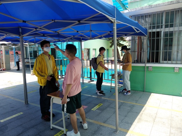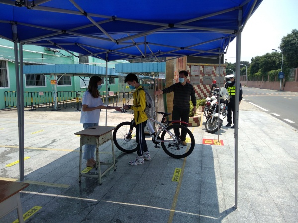 12:00剛過,負責進行交通疏導的公安民警早早來到校門口,以防接送學生的車輛在校門口發(fā)生擁堵。12:30分后,同學們陸續(xù)來到學校,按照地面張貼的引導標線來到進校通道,老師先掃同學們粵康碼,正常后,再到體溫測檢測處,測體溫正常,進行手部消毒,然后才能進入校園。