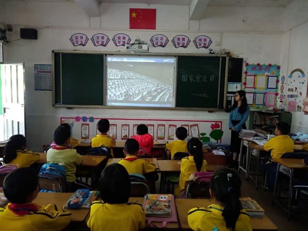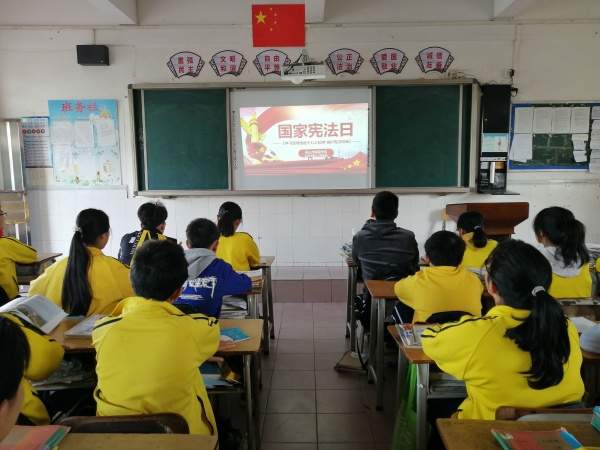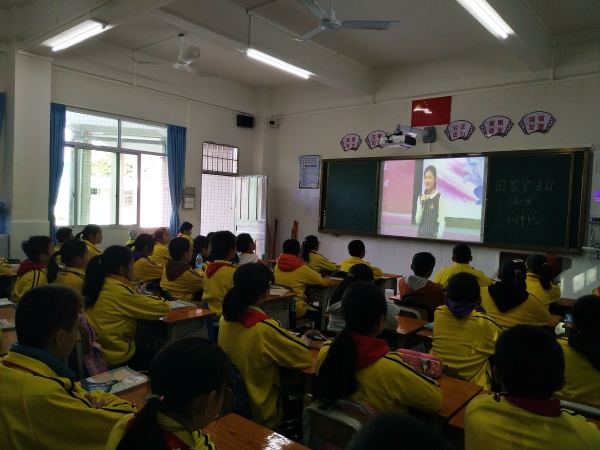 憲法是國家的根本法,是治國安邦的總章程。憲法教育是法治教育的首要內(nèi)容,也是學(xué)校開展法制教育的根基,是每個學(xué)生的必修課。12月4日的第一節(jié)課上,在學(xué)校的統(tǒng)一安排布置下,華強學(xué)校的各班班主任組織學(xué)生朗讀了憲法中的部分章節(jié)。觀看本校制作的憲法PPT課件,同學(xué)們嚴肅地凝視著大屏幕,邊朗讀邊進行理解、記憶,朗朗的晨讀聲回蕩在華強學(xué)校的校園里,使人肅穆。上午9:00時,全校38個班級共同觀看普法網(wǎng)上直播視頻,認真聆聽了里面每一位學(xué)生的精彩演講,全校學(xué)生受益匪淺。