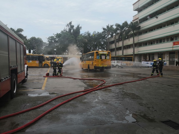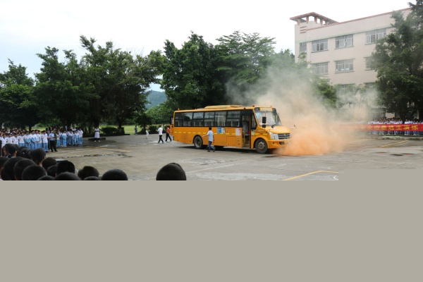 演練分兩個科目進行,科目一是宣傳教育。由神灣鎮(zhèn)交警大隊彭曉藍警官講解校車安全事故中逃生知識。彭警官為學生講解了校車起火時的撤離、校車碰撞時的自我防護、被困車內(nèi)時逃生錘的使用以及校車逃生門的使用,讓同學們受益匪淺。接著進行了科目二的實景模擬演練中,一輛校車從校門駛入校園停車場,突然有一名學生發(fā)現(xiàn)校車的尾部冒出“濃煙”,立即大聲報告:“汽車著火啦!”,司機聽到報告后迅速停車,熄匙,打開車門。跟車老師立即向?qū)W生大聲通知:“車著火!大家鎮(zhèn)定!聽從指揮,要快速有序地下車!” 所有學生立即解開安全帶,引導老師利用應急手動開關打開乘客門和應急門,跟車老師發(fā)布指令:“車輛起火,立即疏散,聽從統(tǒng)一指揮,不擁擠。”學生們彎著腰,用毛巾、衣物捂著嘴鼻迅速有序地從逃生門和前車門及時撤出,快速撤離到距離校車50米外的安全區(qū)域集合,校領導接到報告后馬上報警,消防車迅速趕到現(xiàn)場滅火,交警隨即趕到現(xiàn)場指揮交通,醫(yī)院醫(yī)生也趕到現(xiàn)場救護受傷學生,跟車老師清點學生人數(shù)上報總指揮,全程緊張有序。