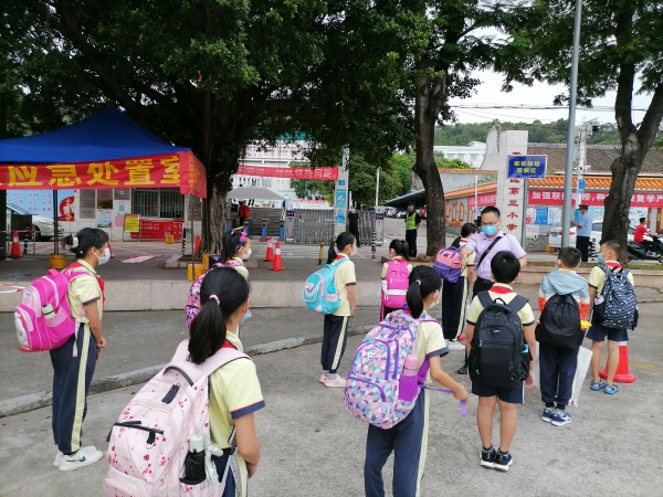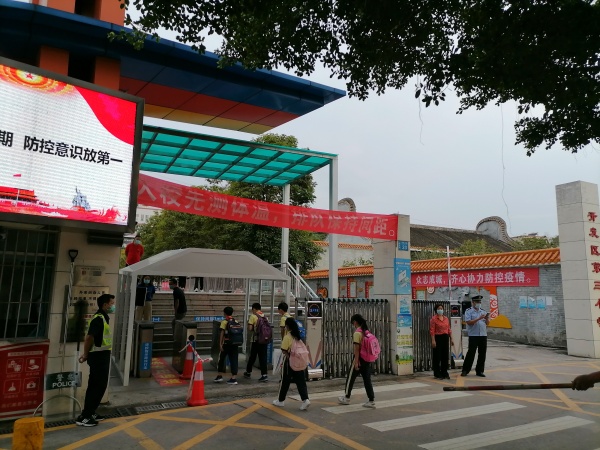 三小按照上級(jí)要求全力做好疫情防控和返校復(fù)課各項(xiàng)工作,精心策劃、科學(xué)安排、周密組織學(xué)生和教職員工返校。當(dāng)天早上6點(diǎn)多,三小校門口負(fù)責(zé)檢測(cè)和維持現(xiàn)場(chǎng)秩序的老師、工作人員已經(jīng)到崗做準(zhǔn)備。7點(diǎn)15分至45分,學(xué)生按照學(xué)校安排,錯(cuò)峰排隊(duì)進(jìn)入校園。每名同學(xué)都自覺佩戴了口罩,每個(gè)人之間隔了一米以上,沒有三三兩兩聚在一起的現(xiàn)象。老師們則來回巡視,提醒同學(xué)們不要隨意摘口罩、相隔遠(yuǎn)一點(diǎn)。