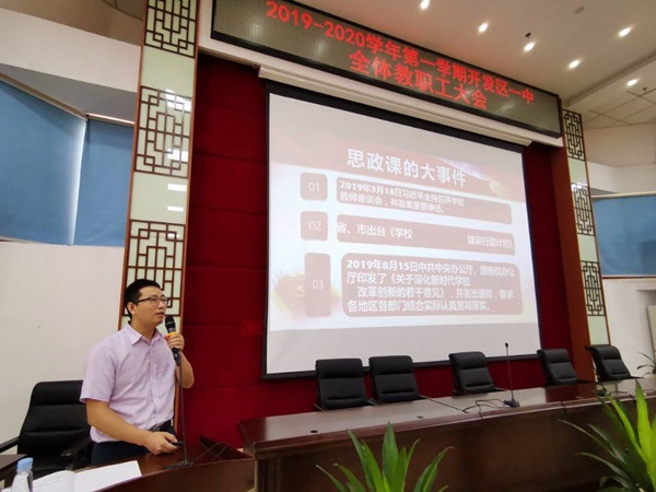 2019年9月1日上午,開發(fā)區(qū)一中新學期工作部署會在階梯報告廳召開。劉利民校長在會上作了題為《黨員領頭,評估領先,積淀特色,不負人民》的講話,本學期全體教師要按照“守初心,擔使命,找差距,抓落實”的總要求,推進“不忘初心,牢記使命”主題教育,力爭理論學習有收獲,思想政治受洗禮,干事創(chuàng)業(yè)敢擔當,為民服務解難題,清正廉潔做表率。以黨建端正辦學思想,以黨建堅定理想信念,以黨建鑄造職業(yè)精神。他希望老師們對照區(qū)公辦中小學年度實績考評體系,做好學校各項工作,嚴守師德“十不”底線,做到教育不要傷害;要厚植自主文化,積淀辦學特色,立足學生高水平自治、自主導師群起、行政傳承創(chuàng)新、家委共治的現(xiàn)有良好態(tài)勢,進一步推動全面培訓、全面自評,提升開發(fā)自主動力。他希望老師們珍惜人民的選擇,做有教育情懷的教師,讓開發(fā)區(qū)一中永葆常青本色。