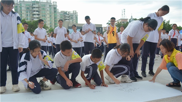“我是中華民族的兒女,不忘恥辱,堅(jiān)決與毒魔作斗爭,珍愛生命,拒絕毒品,保證不吸毒、不制毒、不種毒、不販毒,積極檢舉販毒行為,自覺抵御毒品的侵蝕,積極投身于禁毒斗爭行列,我將履行禁毒誓言,為國家禁毒事業(yè)作出自己應(yīng)有的貢獻(xiàn)”。錚錚誓言在校園內(nèi)久久回蕩,直上云霄。在場同學(xué)鄭重宣誓后,各班學(xué)生代表上臺簽名并書寫自己醞釀出來的禁毒標(biāo)語。